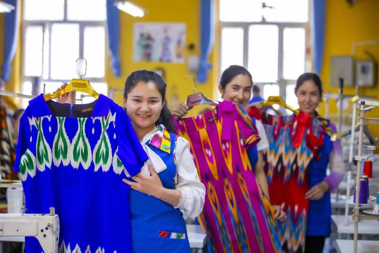 Employees of a garment factory in a village of Lop county, Hotan prefecture, northwest China’s Xinjiang Uygur autonomous region, show the clothes they just made with Atlas silk, a traditional type of silk in Xinjiang, April 20, 2022. (Photo by Maimaitiaili Ainiwaer/People’s Daily Online)