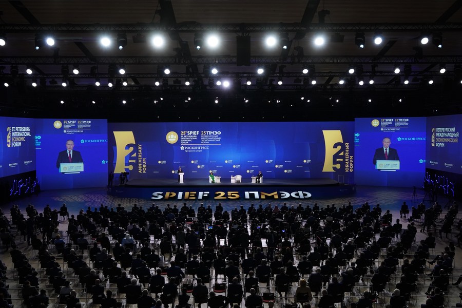 ST. PETERSBURG, June 18 (Xinhua) -- Russian President Vladimir Putin explained Russia's stance and policy on hotspot political and economic issues during the 25th St. Petersburg International Economic Forum on Friday.