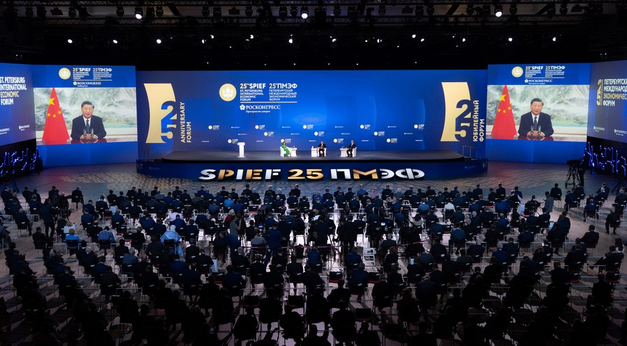 BEIJING, June 19 (Xinhua) -- Chinese President Xi Jinping on Friday addressed the plenary session of the 25th St. Petersburg International Economic Forum (SPIEF) in virtual format, in which he put forward four proposals to advance global solidarity for sustainable development.