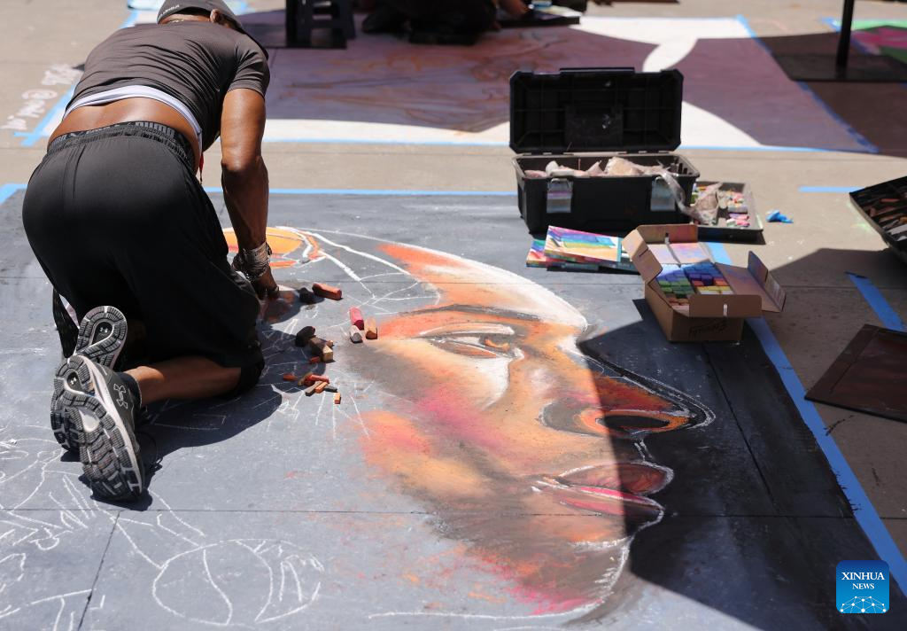 A chalk artist creates a work during Pasadena Chalk Festival in Pasadena, California, the United States, on June 18, 2022. The annual Pasadena Chalk Festival is held in Pasadena from June 18 to June 19, attracting over 500 chalk artists here to celebrate the festival. (Xinhua)