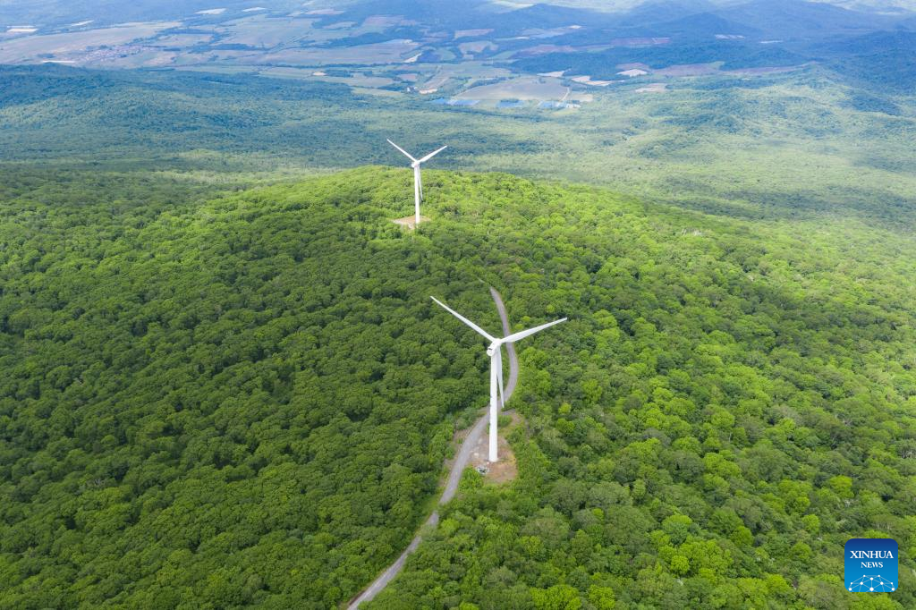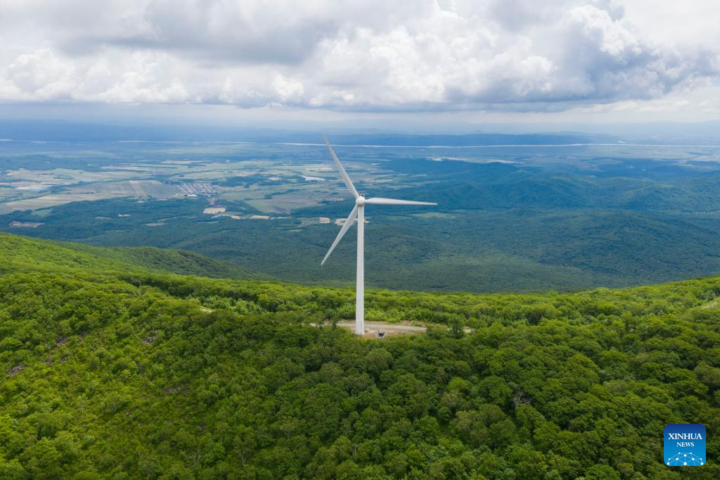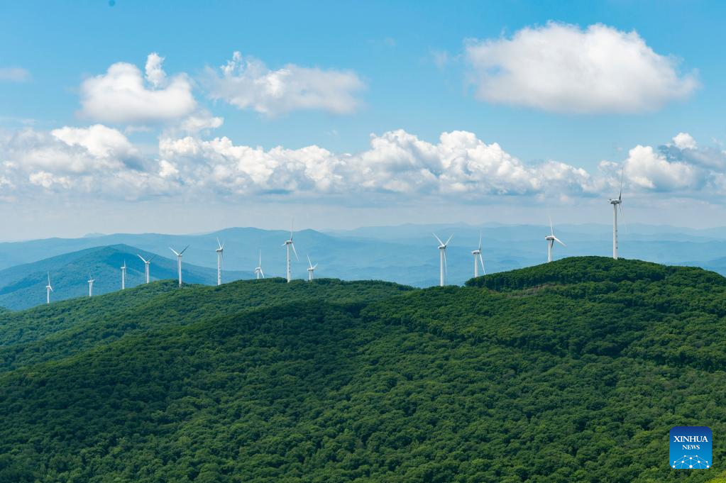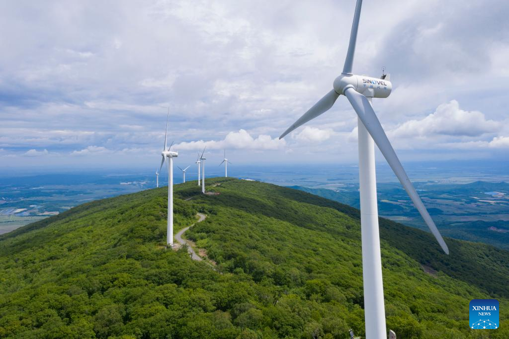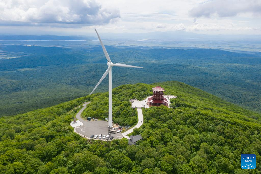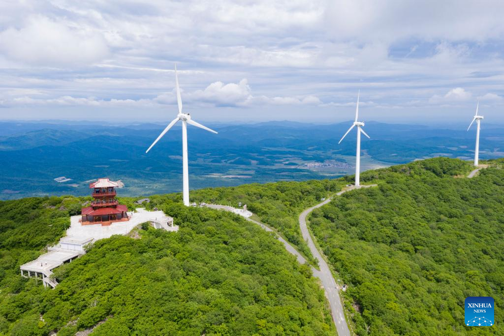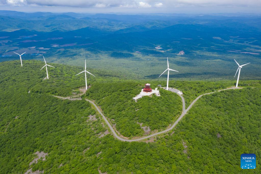 Aerial photo taken on June 19, 2022 shows wind turbines in Dadingzi Mountain Forest Park in Raohe County, northeast China's Heilongjiang Province. (Xinhua/Xie Jianfei)