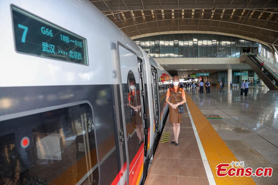 A train attendant welcomes passengers on the platform at the Wuhan railway station to Beijing in Wuhan, central China's Hubei Province, June 20, 2022. (Photo: China News Service/Zhang Chang)