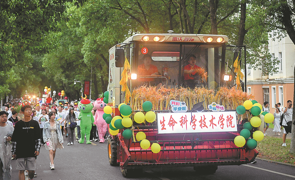 A harvester cruises in a parade at Huazhong Agricultural University, Wuhan, capital of Hubei province, on Sunday. The university held the special parade of modern agricultural vehicles to celebrate the graduation season. [Photo/Xinhua]