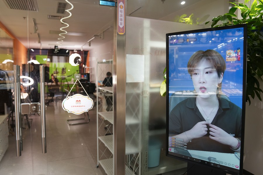 A screen shows a staff member promoting pearl jewelry through livestreaming at Hongqiao Pearl Market in Dongcheng District of Beijing, capital of China, June 18, 2022. (Xinhua/Ju Huanzong)