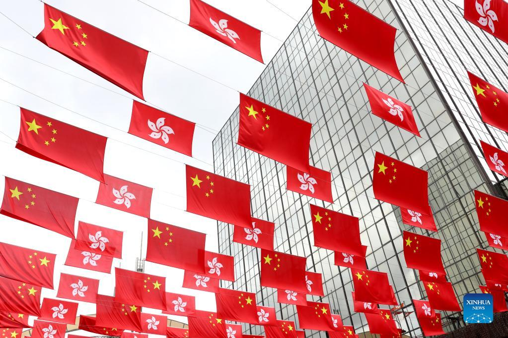 China's national flags and the Hong Kong Special Administrative Region (HKSAR) flags are hung above a street in Hong Kong, south China, June 20, 2022. This year marks the 25th anniversary of Hong Kong's return to the motherland. (Xinhua/Wu Xiaochu)