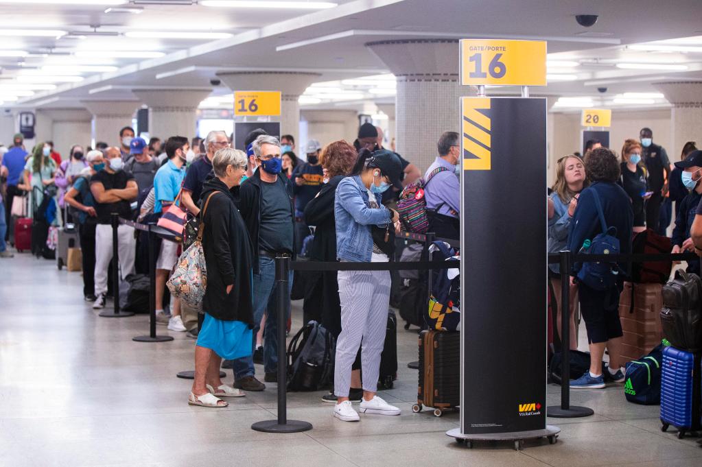 People line up at Union Station in Toronto, Ontario, Canada, on June 20, 2022. The Canadian federal government started to suspend vaccination requirements against COVID-19 for domestic and outbound travel, federally regulated transportation sectors and federal government employees as of June 20. (Photo by Zou Zheng/Xinhua)