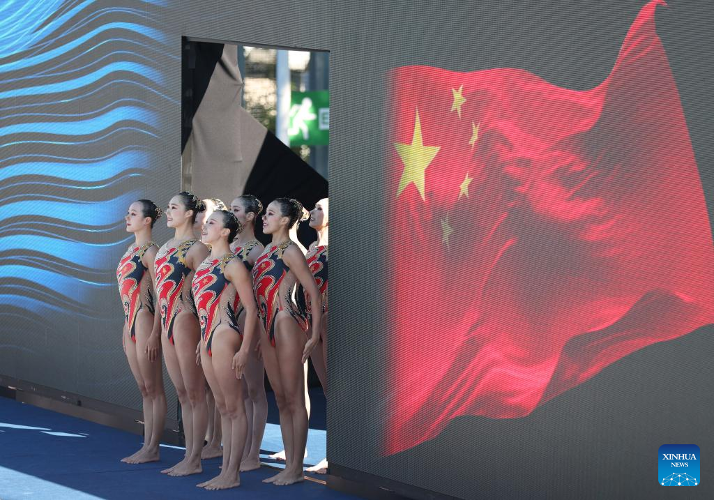 Team China perform during the Artistic Swimming Women's Team Technical Final of the 19th FINA World Championships in Budapest, Hungary on June 21, 2022. (Xinhua/Li Ying)