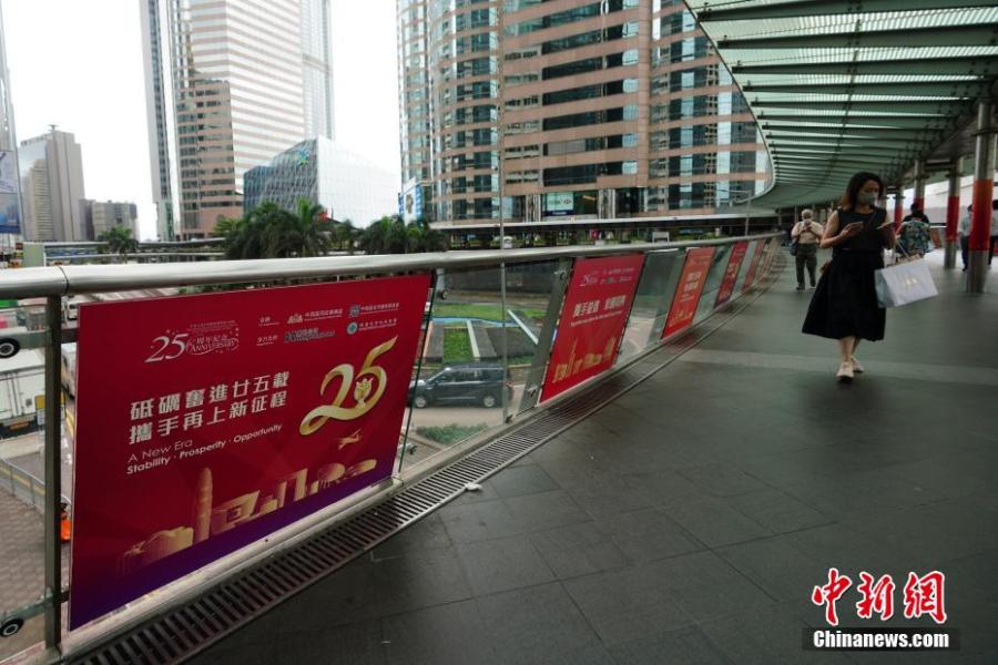 Posters celebrating the 25th anniversary of Hong Kong's return to the motherland are seen on the railings of a footbridgein the Hong Kong Special Administrative Region, June, 21, 2022. (Photo: China News Service/Zhang Wei)