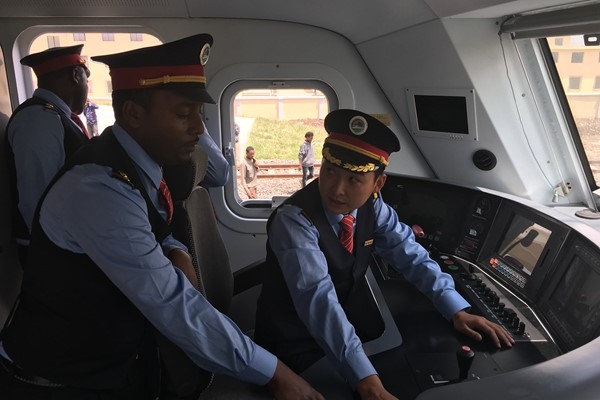 A Chinese train driver instructs an Ethiopian train driver in train driving. (Photo courtesy of China Railway No.2 Engineering Group)
