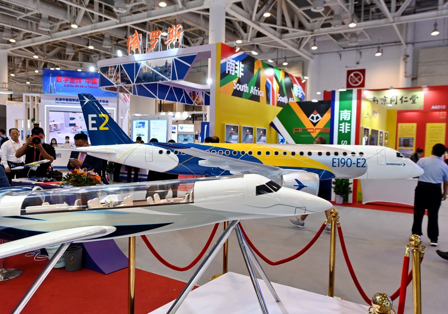 Photo taken on Sept. 8, 2021 shows models of jets during an exhibition on BRICS New Industrial Revolution held in Xiamen, southeast China's Fujian Province. (Xinhua/Lin Shanchuan)