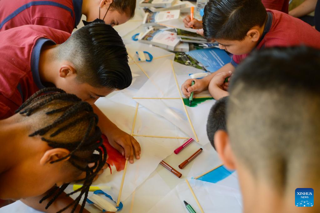 Students design their kites during the Chinese kite festival in Kalkara, Malta, on June 22, 2022. The Esplora Interactive Science Center in Malta was bustling with activities on Wednesday as students from primary schools got a break from the classroom to attend the 4th edition of the Chinese kite festival. (Photo by Jonathan Borg/Xinhua)