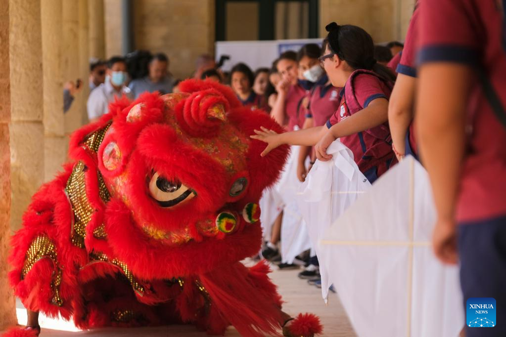 A kite exhibition is held during the Chinese kite festival in Kalkara, Malta, on June 22, 2022. The Esplora Interactive Science Center in Malta was bustling with activities on Wednesday as students from primary schools got a break from the classroom to attend the 4th edition of the Chinese kite festival. (Photo by Jonathan Borg/Xinhua)
