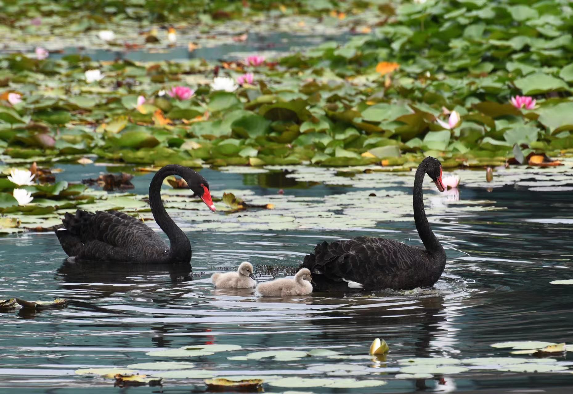 Baby black swans, accompanied by their parents, forage and play in the Nansi Lake in Zaozhuang city, east China’s Shandong province, August 24, 2019. A total of 53 rivers flow into the lake, which boasts rich biodiversity and is the place where many migratory birds spend the winter, multiply and rest during a long journey. (People’s Daily Online/Li Zongxian)