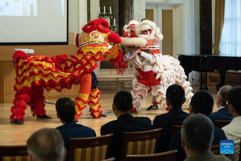 Artists perform lion dance during a ceremony celebrating the 15th anniversary of the Confucius Institute at Eotvos Lorand University (ELTE) in Budapest, Hungary, June 21, 2022. The Confucius Institute at ELTE in Hungary celebrated its 15th founding anniversary here Tuesday night. Nearly 100 people attended the celebration, including Hungarian Deputy Minister of Culture and Innovation Eszter Vitalyos, and Charge d'Affaires at the Chinese Embassy in Hungary Liu Bo. (Photo by Attila Volgyi/Xinhua)