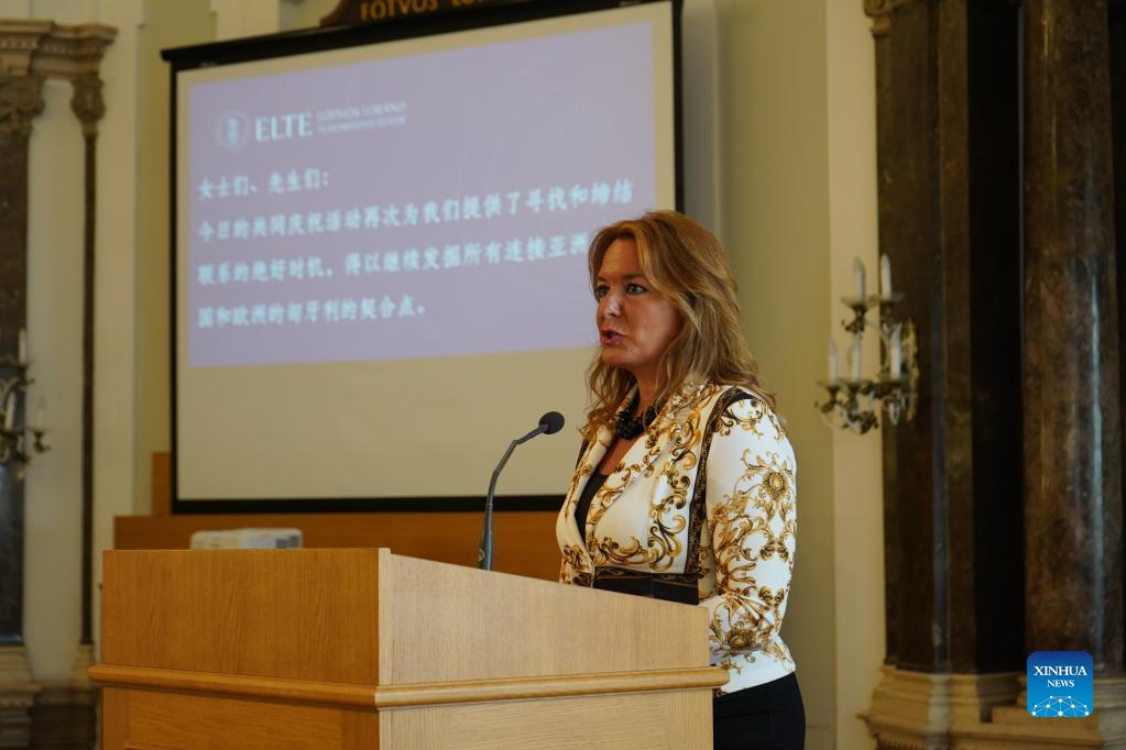 Hungarian Deputy Minister of Culture and Innovation Eszter Vitalyos speaks during a ceremony celebrating the 15th anniversary of the Confucius Institute at Eotvos Lorand University (ELTE) in Budapest, Hungary, June 21, 2022. The Confucius Institute at ELTE in Hungary celebrated its 15th founding anniversary here Tuesday night. Nearly 100 people attended the celebration, including Hungarian Deputy Minister of Culture and Innovation Eszter Vitalyos, and Charge d'Affaires at the Chinese Embassy in Hungary Liu Bo. (Xinhua/Chen Hao)