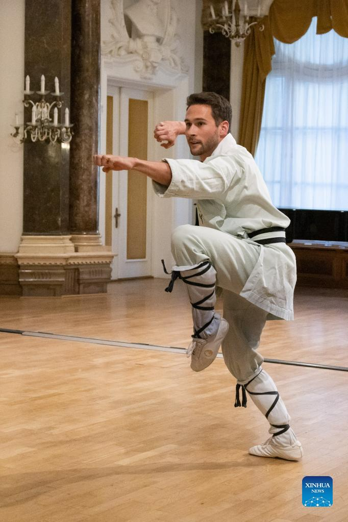 An artist performs martial arts during a ceremony celebrating the 15th anniversary of the Confucius Institute at Eotvos Lorand University (ELTE) in Budapest, Hungary, June 21, 2022. The Confucius Institute at ELTE in Hungary celebrated its 15th founding anniversary here Tuesday night. Nearly 100 people attended the celebration, including Hungarian Deputy Minister of Culture and Innovation Eszter Vitalyos, and Charge d'Affaires at the Chinese Embassy in Hungary Liu Bo. (Photo by Attila Volgyi/Xinhua)