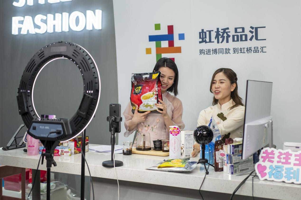 Vietnamese hosts introduce Vietnamese coffee on a livestream platform to Chinese consumers at the Hongqiao Import Commodity Exhibition and Trade Center in Shanghai, Jan. 10, 2022. (People's Daily Online/Wang Chu)