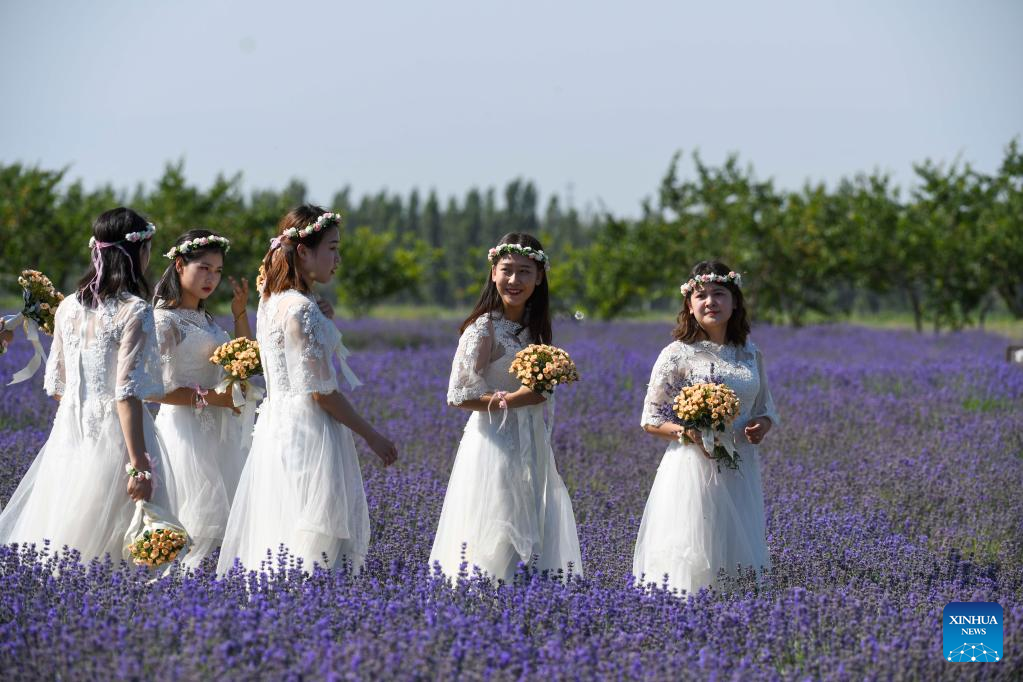 Image ambassadors walk in lavender fields in Sigong Village, Huocheng County of northwest China's Xinjiang Uygur Autonomous Region, June 22, 2022. Sigong Village has planted 12,000 mu (about 800 hectares) of lavender. The lavender planting bases here have promoted local tourism and lavendar processing industry. In 2021, per capita income in Silong Village reached 25,000 yuan (3,735 US dollars). (Xinhua/Zhao Ge)