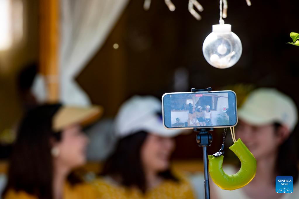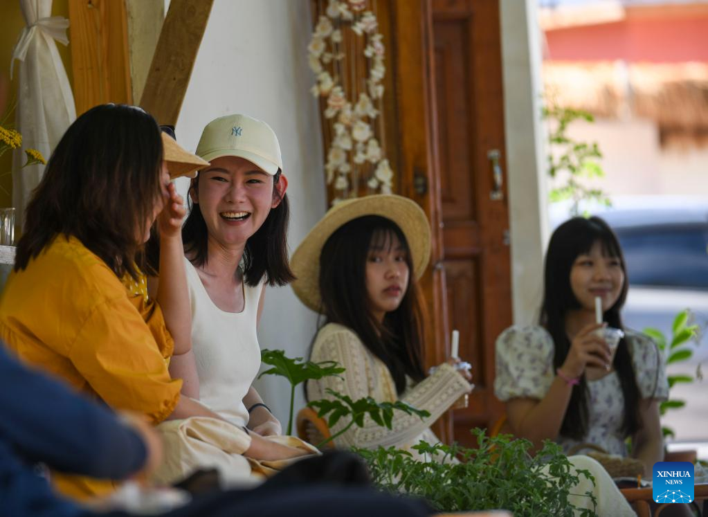 Tourists are seen at a coffee shop in Sigong Village, Huocheng County of northwest China's Xinjiang Uygur Autonomous Region, June 22, 2022. Sigong Village has planted 12,000 mu (about 800 hectares) of lavender. The lavender planting bases here have promoted local tourism and lavendar processing industry. In 2021, per capita income in Silong Village reached 25,000 yuan (3,735 US dollars). (Xinhua/Ma Kai)