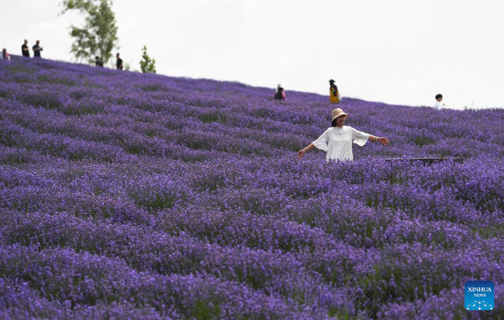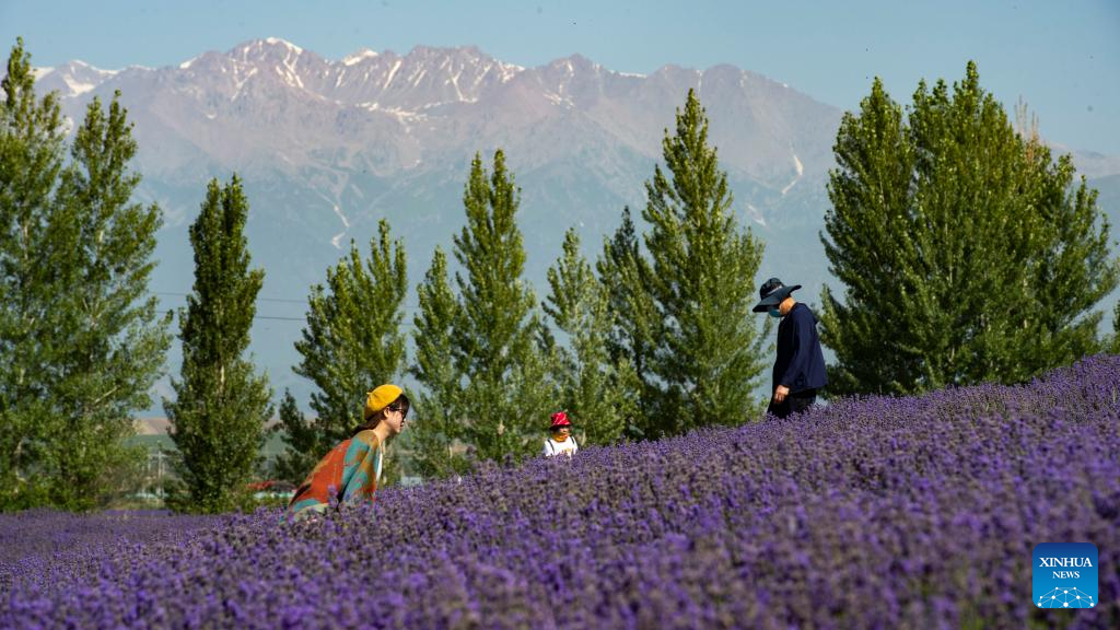 Tourists pose for photos in lavender fields in Sigong Village, Huocheng County of northwest China's Xinjiang Uygur Autonomous Region, June 22, 2022. Sigong Village has planted 12,000 mu (about 800 hectares) of lavender. The lavender planting bases here have promoted local tourism and lavendar processing industry. In 2021, per capita income in Silong Village reached 25,000 yuan (3,735 US dollars). (Xinhua/Ma Kai)
