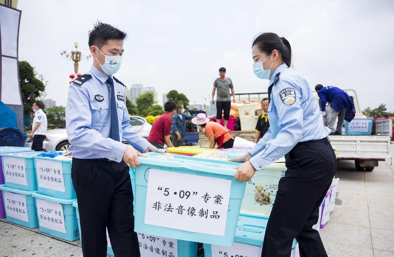 Pirated and illegal publications are destroyed by law enforcement officers in Duchang county, Jiujiang city, east China's Jiangxi province, April 26, 2022. (Photo by Fu Jianbin/People's Daily Online)