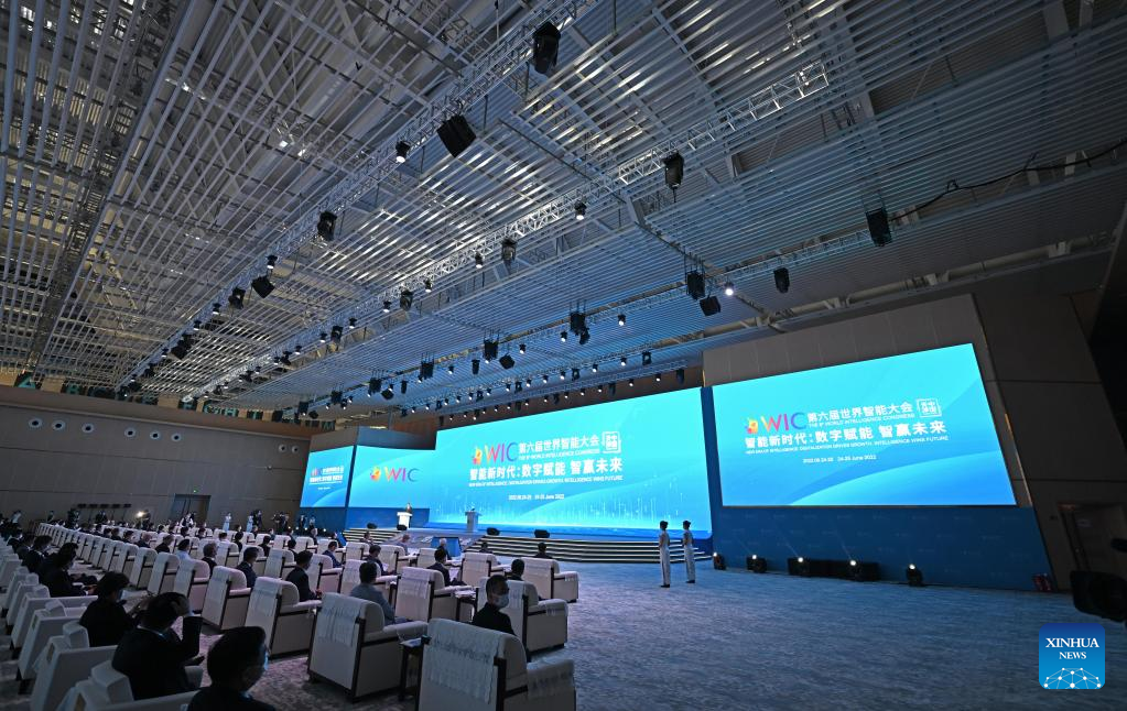 Participants arrive to attend the online opening ceremony of the 6th World Intelligence Congress and Summit on Innovation and Development in north China's Tianjin, June 24, 2022. (Xinhua/Zhao Zishuo)