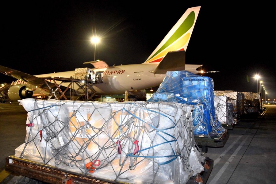 The medical supplies donated by China arrive at Or Tambo International Airport in Johannesburg, South Africa, April 14, 2020. (Chinese Embassy in South Africa/Handout via Xinhua)