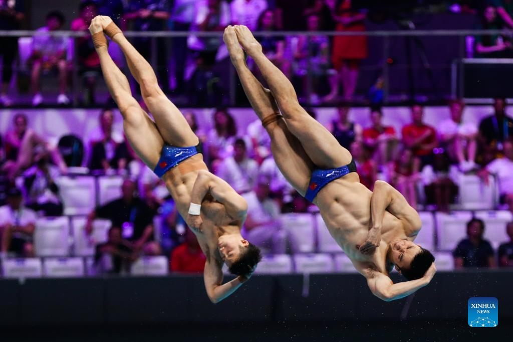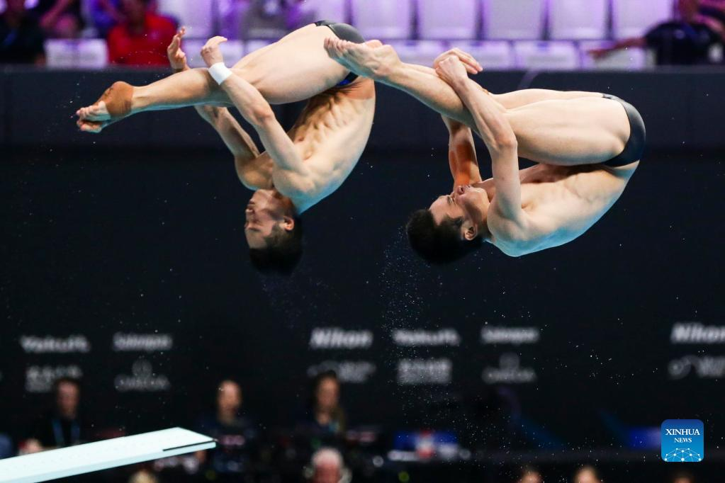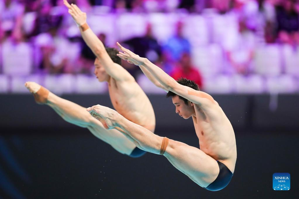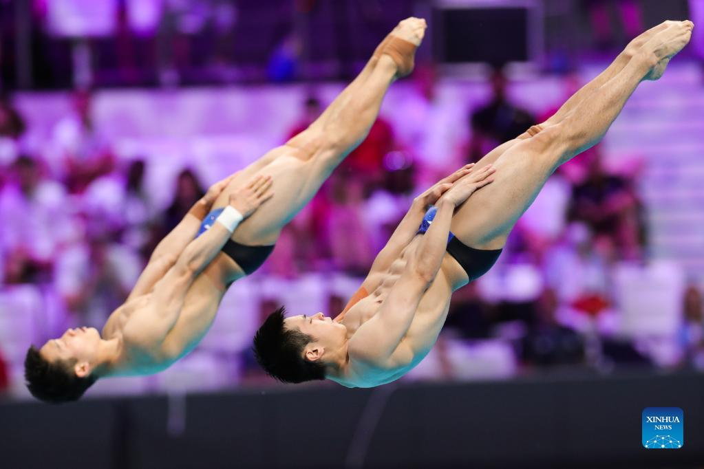 Cao Yuan (R) and Wang Zongyuan of China compete during the Men's 3m Synchronised final of diving at the 19th FINA World Championships in Budapest, Hungary, June 26, 2022. (Xinhua/Zheng Huansong)