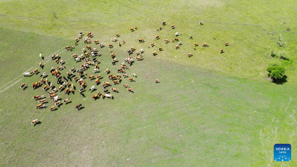 Aerial photo taken on June 26, 2022 shows a herd of cattle on the summer pasture in Xin Barag Zuoqi of Hulun Buir City, north China's Inner Mongolia Autonomous Region. (Xinhua/Bei He)