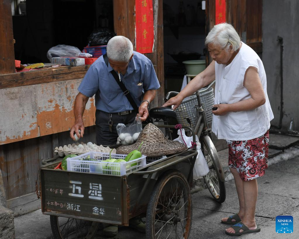 A resident buys duck eggs in the ancient city of Taizhou, Linhai, east China's Zhejiang Province, June 25, 2022.