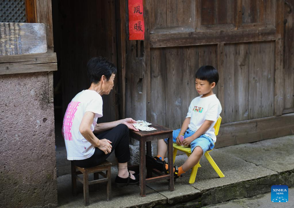 A boy plays with his grandmother in the ancient city of Taizhou, Linhai, east China's Zhejiang Province, June 25, 2022.