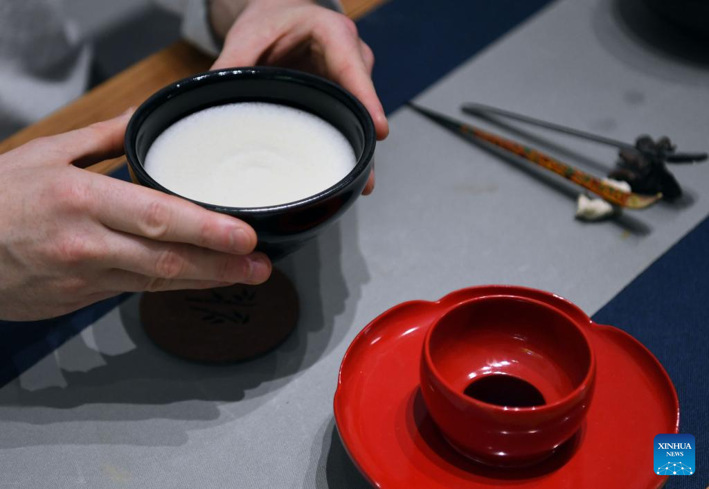 David Mills puts tea powder into a piece of tea ware in Zhengzhou, central China's Henan Province, June 22, 2022.