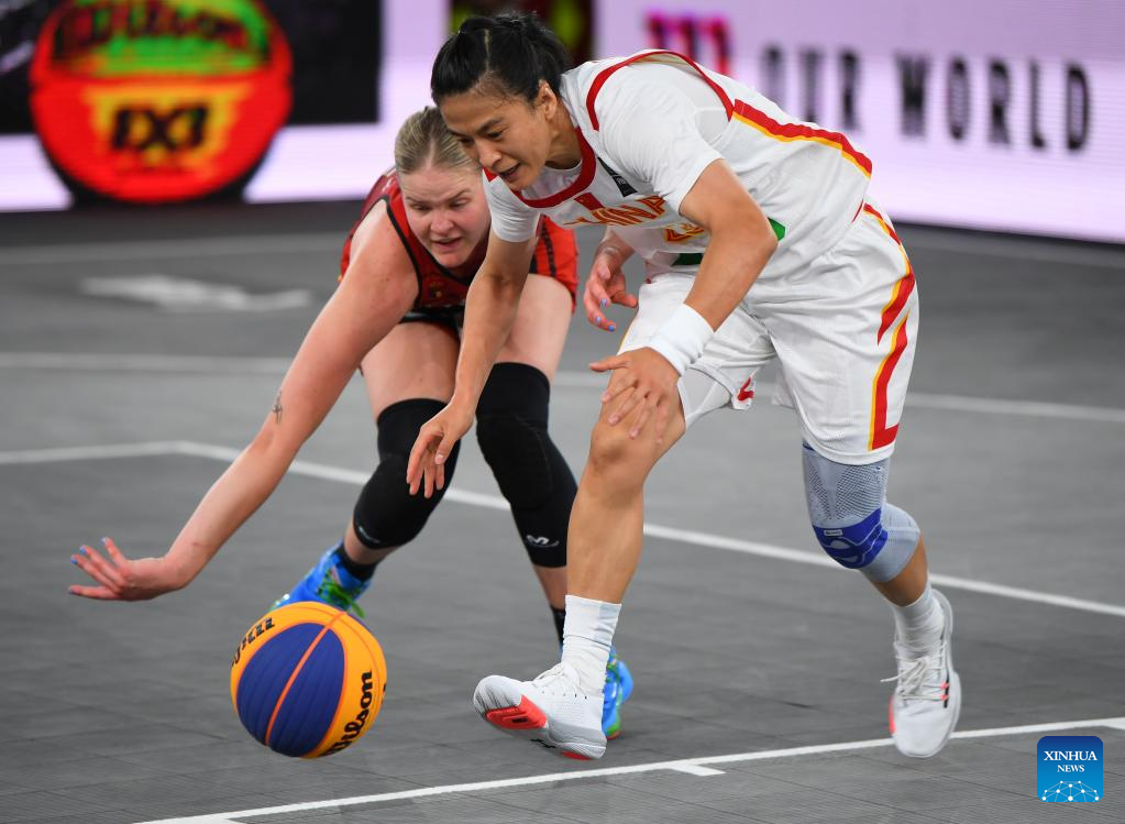 Zhang Zhiting (R) of China vies with Becky Massey of Belgium during the FIBA 3X3 World Cup women's quarterfinal match between China and Belgium in Antwerp, Belgium, June 25, 2022. (Xinhua/Ren Pengfei)