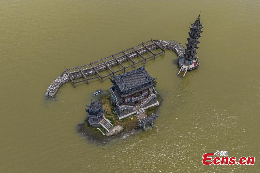 Photo shows the flooded historic site of Luoxingdun Island in Poyang Lake of Lushan City, east China's Jiangxi Province, June 25, 2022. The water level of Poyang Lake, China's biggest freshwater lake, continued to rise due to the heavy rainfall. (Photo: China News Service/Ma Gang)