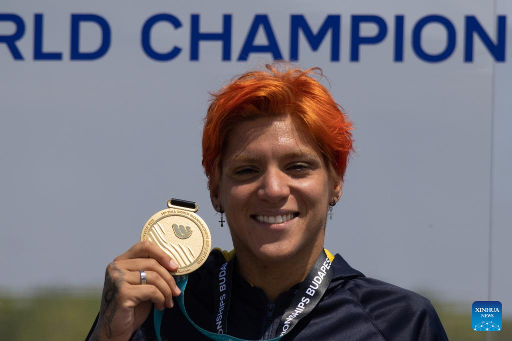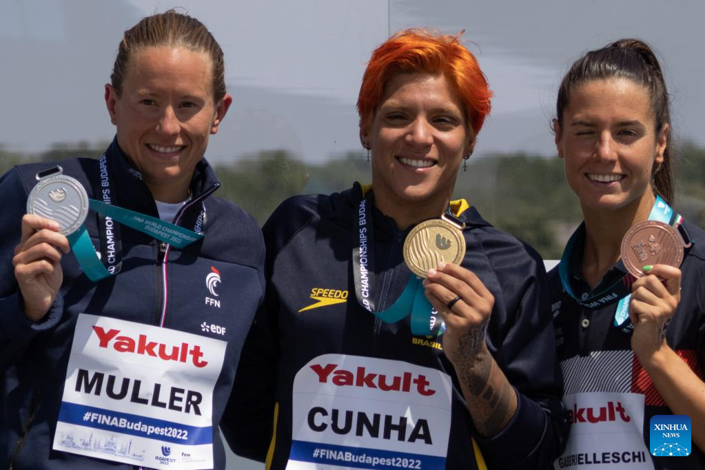 Gold medalist Ana Marcela Cunha of Brazil poses during the awarding ceremony of the women's 5km open water at the 19th FINA World Championships in Budapest, Hungary, June 27, 2022. (Photo by Attila Volgyi/Xinhua)