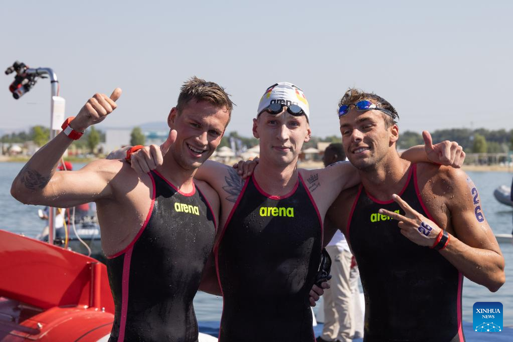 Gold medalist Florian Wellbrock (C) of Germany, silver medalist Gregorio Paltrinieri (R) of Italy and bronze medalist Mykhailo Romanchuk of Ukraine pose after the men's 5km open water at the 19th FINA World Championships in Budapest, Hungary, June 27, 2022. (Photo by Attila Volgyi/Xinhua)