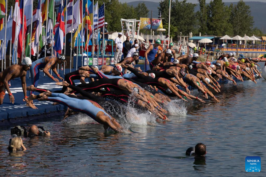 Gold medalist Florian Wellbrock of Germany competes during the men's 5km open water at the 19th FINA World Championships in Budapest, Hungary, June 27, 2022. (Photo by Attila Volgyi/Xinhua)