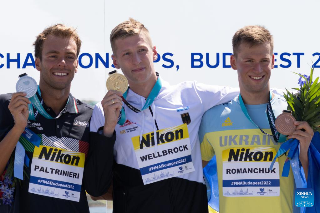 Gold medalist Florian Wellbrock of Germany poses during the awarding ceremony of the men's 5km open water at the 19th FINA World Championships in Budapest, Hungary, June 27, 2022. (Photo by Attila Volgyi/Xinhua)
