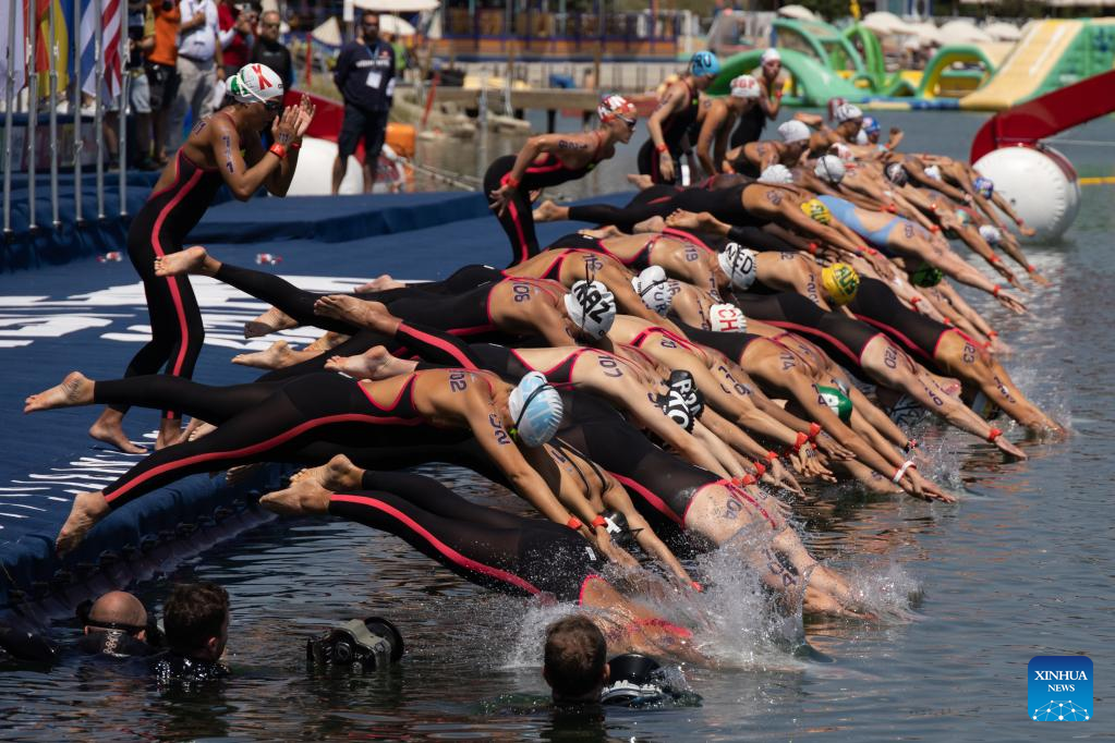 Athletes compete during the women's 5km open water at the 19th FINA World Championships in Budapest, Hungary, June 27, 2022. (Photo by Attila Volgyi/Xinhua)
