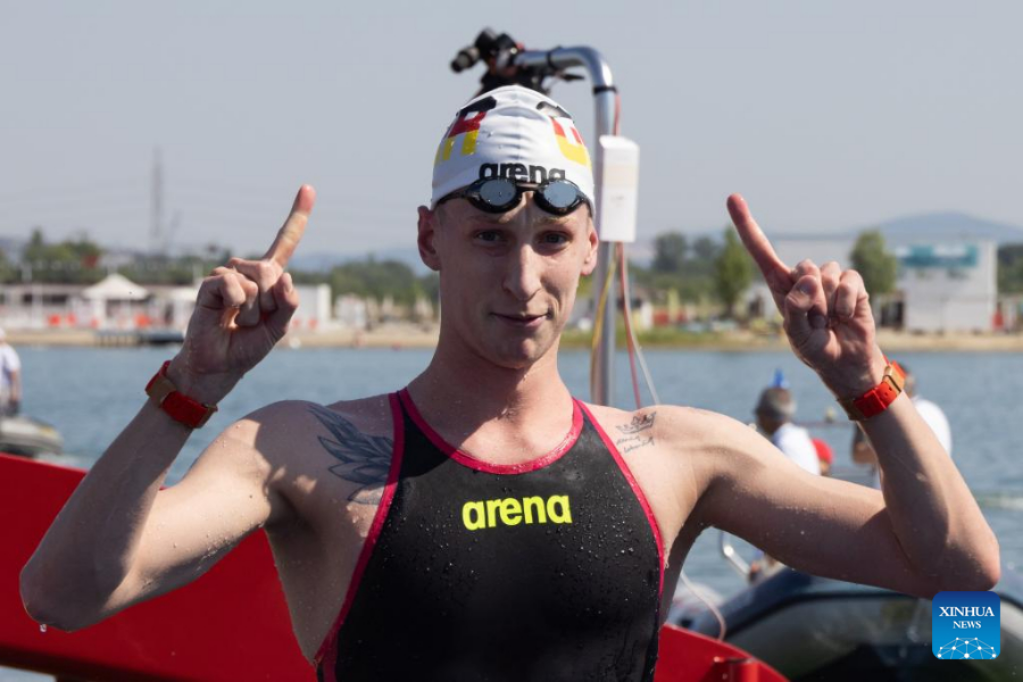 Gold medalist Florian Wellbrock of Germany celebrates after the men's 5km open water at the 19th FINA World Championships in Budapest, Hungary, June 27, 2022. (Photo by Attila Volgyi/Xinhua)