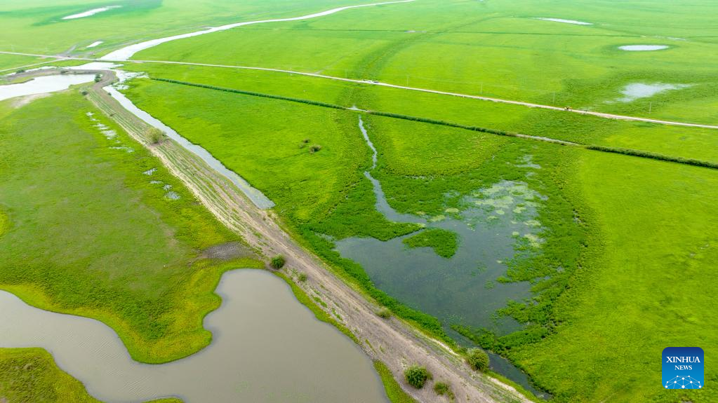 Aerial photo taken on June 20, 2022 shows the Nenjiang Wetland in Zhenlai County, Baicheng City of northeast China's Jilin Province. Located in the west of Jilin Province, Zhenlai County had long troubled by drought, sandstorm and soil salinization. In recent years, Zhenlai County has rolled out ecological projects to restore wetland areas. Since 2017, 703,000 mu (about 46,867 hectares) of wetlands have been restored, and the biodiversity here has been improved. (Xinhua/Zhang Nan)