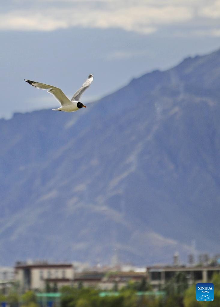 A brown-headed gull hovers over Lhasa River of Lhasa, southwest China's Tibet Autonomous Region, June 26, 2022. (Xinhua/Zhang Rufeng)