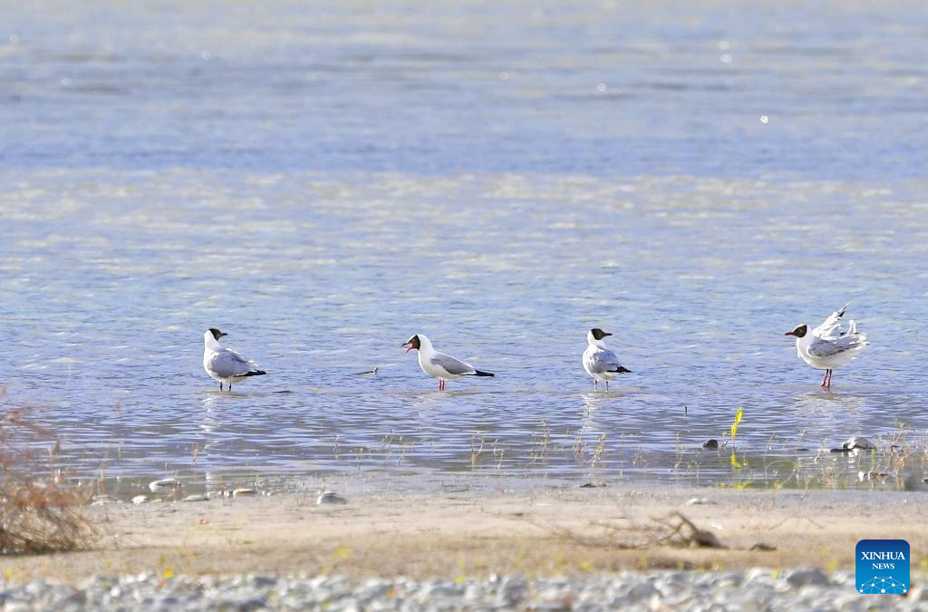 Brown-headed gulls perch near water of Lhasa River in Lhasa, southwest China's Tibet Autonomous Region, June 26, 2022. (Xinhua/Zhang Rufeng)
