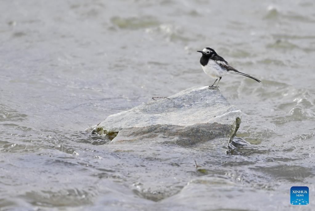 A white wagtail perches on a stone in Lhasa River of Lhasa, southwest China's Tibet Autonomous Region, June 26, 2022. (Xinhua/Zhang Rufeng)