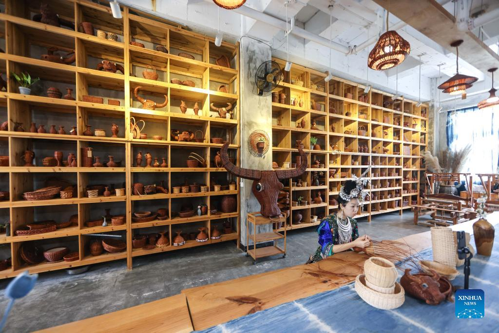 Live streamer Zhang Zhenfei displays the making process of handicraft products made of ferns in Rongjiang County, southwest China's Guizhou Province, June 23, 2022. In recent years new media has played an important role in promoting the rural revitalization projects in Rongjiang County. Local authorities have provided new media skills training service for more than 12,000 people, including inheritors of local intangible cultural heritages, youths returning hometown to start business, relocated residents and local women. It is expected that more than 2,000 livestreaming promotion teams will be fostered in Rongjiang by 2023, which will create jobs for more than 10,000 people. (Xinhua/Ou Dongqu)