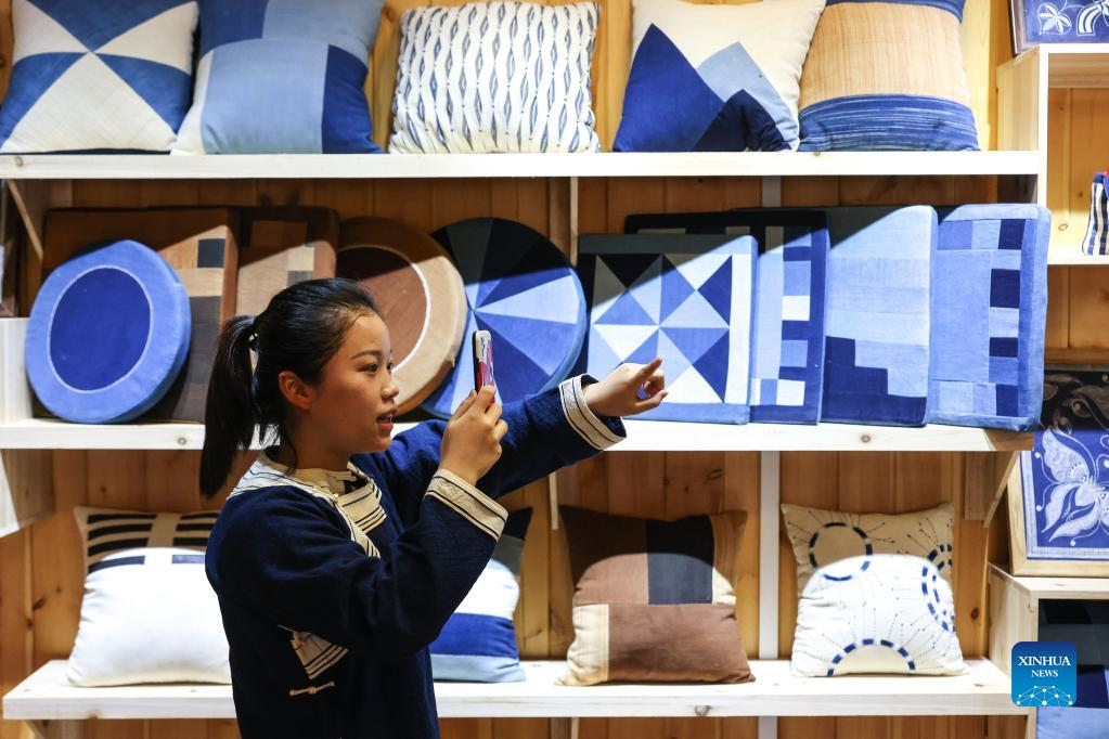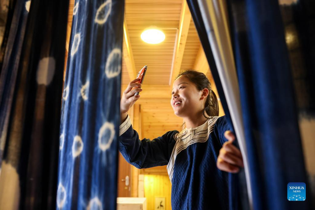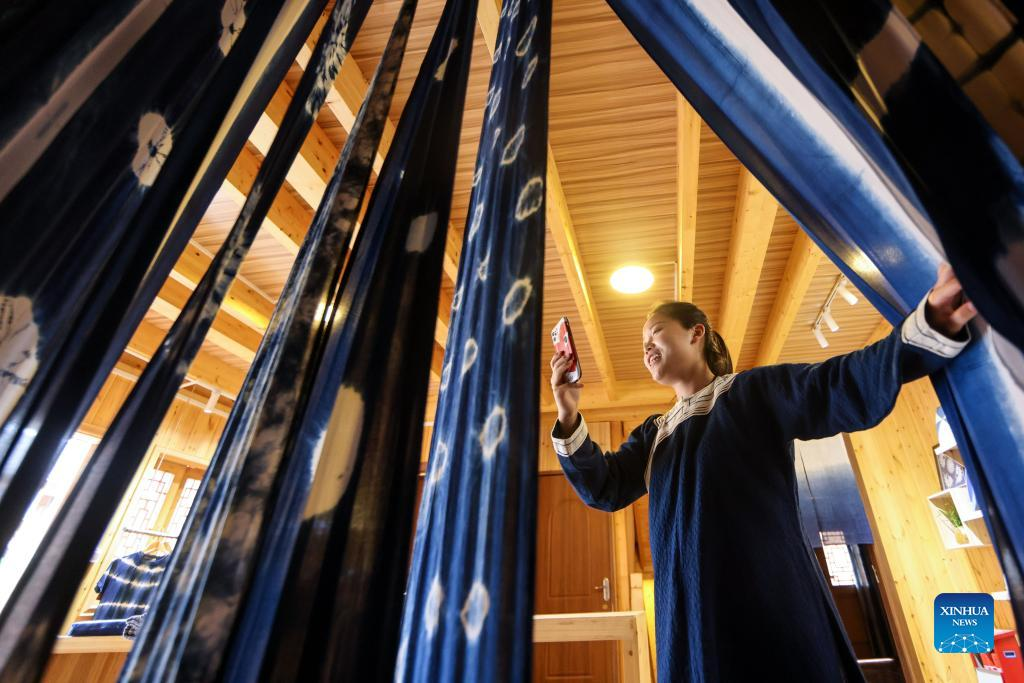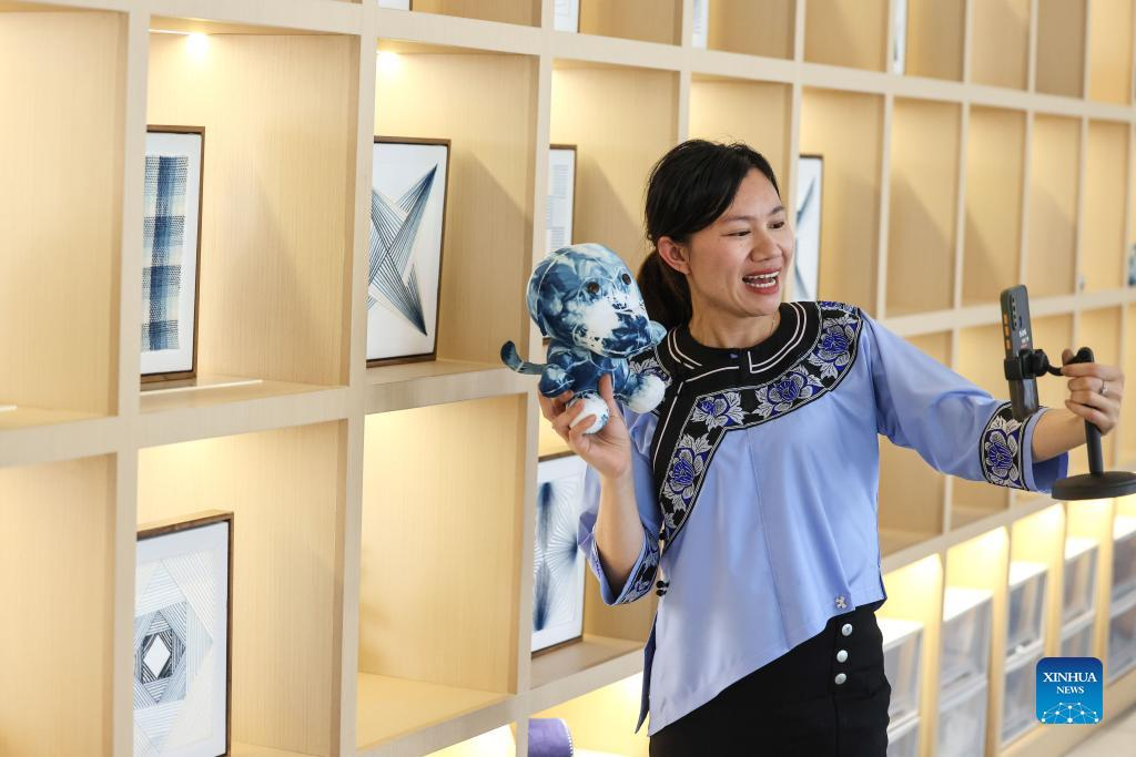 Live streamer Wu Jiamei promotes batik products in Rongjiang County, southwest China's Guizhou Province, June 23, 2022. In recent years new media has played an important role in promoting the rural revitalization projects in Rongjiang County. Local authorities have provided new media skills training service for more than 12,000 people, including inheritors of local intangible cultural heritages, youths returning hometown to start business, relocated residents and local women. It is expected that more than 2,000 livestreaming promotion teams will be fostered in Rongjiang by 2023, which will create jobs for more than 10,000 people. (Xinhua/Ou Dongqu)