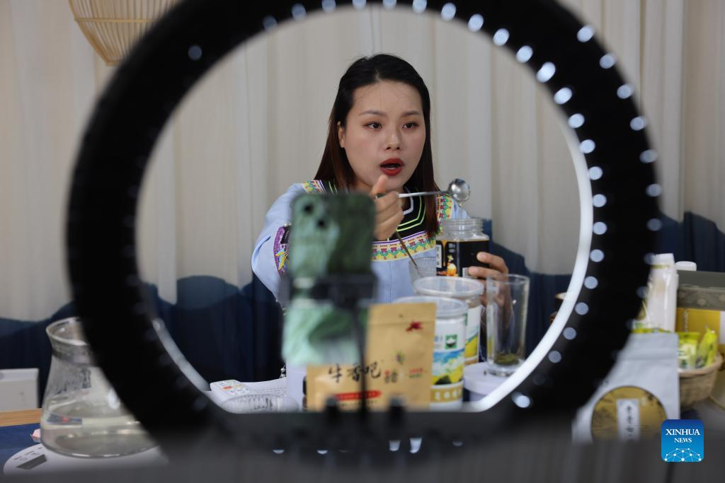 A live streamer of a media company promotes products in Rongjiang County, southwest China's Guizhou Province, June 23, 2022. In recent years new media has played an important role in promoting the rural revitalization projects in Rongjiang County. Local authorities have provided new media skills training service for more than 12,000 people, including inheritors of local intangible cultural heritages, youths returning hometown to start business, relocated residents and local women. It is expected that more than 2,000 livestreaming promotion teams will be fostered in Rongjiang by 2023, which will create jobs for more than 10,000 people. (Xinhua/Ou Dongqu)