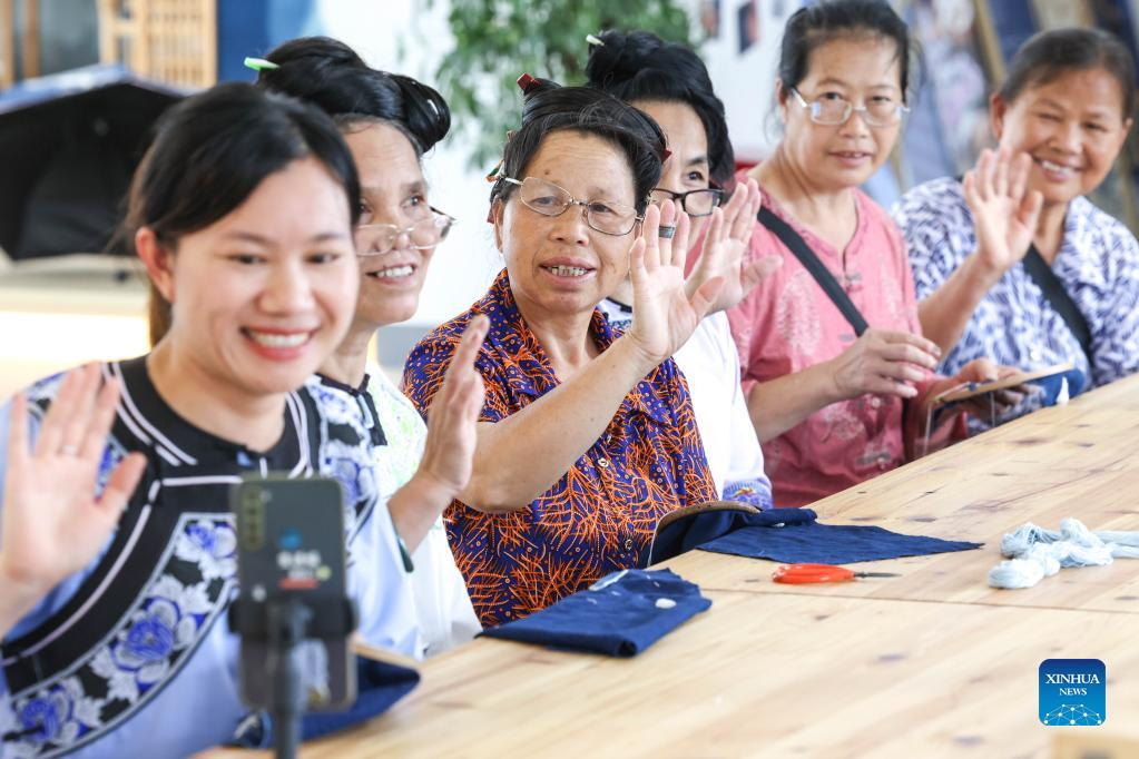 Live streamer Wang Hongdan (1st L) and local embroiderers greet the audience in Rongjiang County, southwest China's Guizhou Province, June 23, 2022. In recent years new media has played an important role in promoting the rural revitalization projects in Rongjiang County. Local authorities have provided new media skills training service for more than 12,000 people, including inheritors of local intangible cultural heritages, youths returning hometown to start business, relocated residents and local women. It is expected that more than 2,000 livestreaming promotion teams will be fostered in Rongjiang by 2023, which will create jobs for more than 10,000 people. (Xinhua/Ou Dongqu)