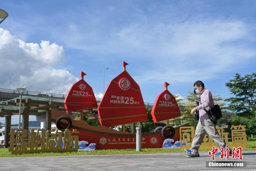 Decorations celebrating the 25th anniversary of the establishment of the Hong Kong Special Administrative Region are displayed in Hong Kong, June 27, 2022. (Photo: China News Service/Chen Yongnuo)