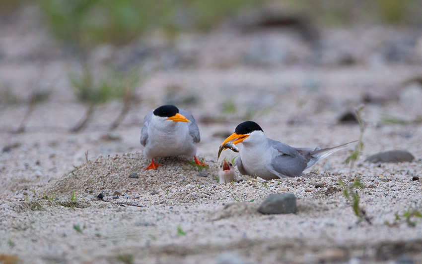 A pair of adult river terns feed their nestling at the Yingjiang National Wetland Park in southwest China's Yunnan Province. (Photo/Sha Yongsheng)